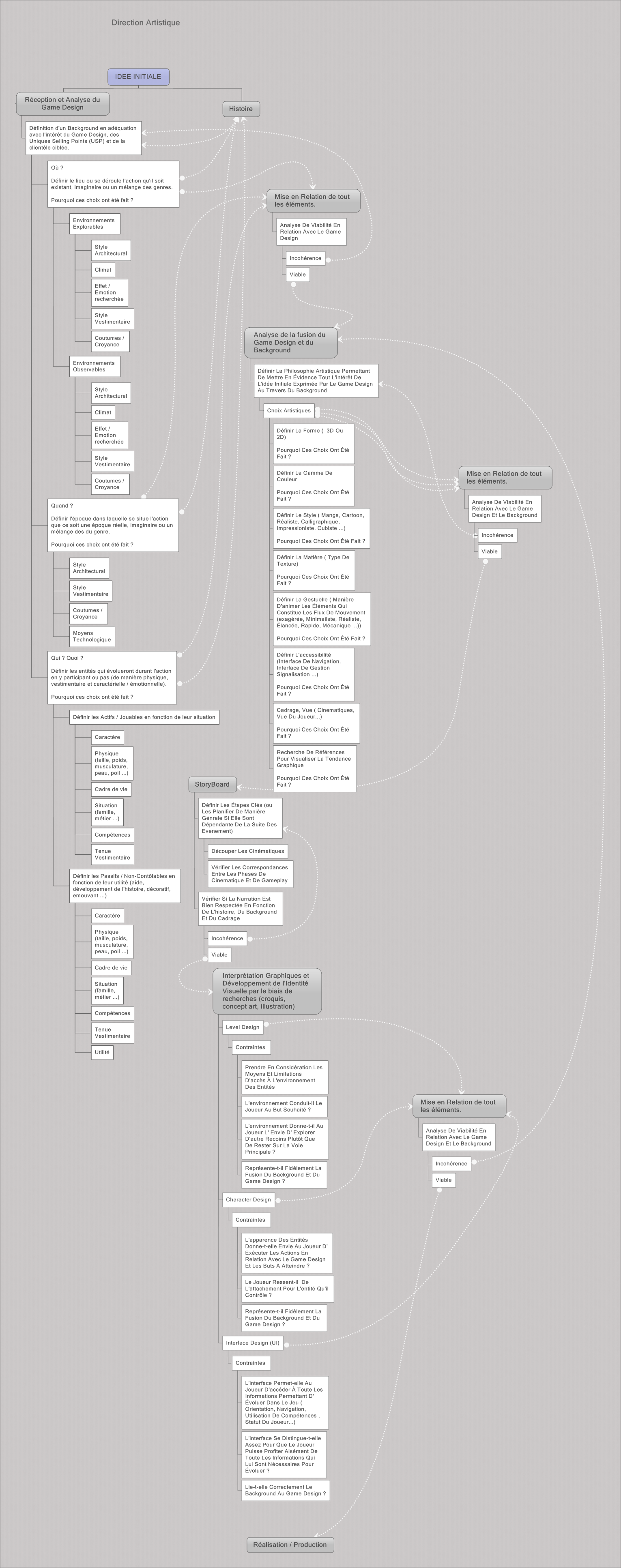 Je vais vous présenter sous la forme d’un organigramme tout ce qu’il me semble important de définir, chronologiquement, pour mener à bien une bonne direction artistique lorsqu’il s’agit d’un jeu vidéo.